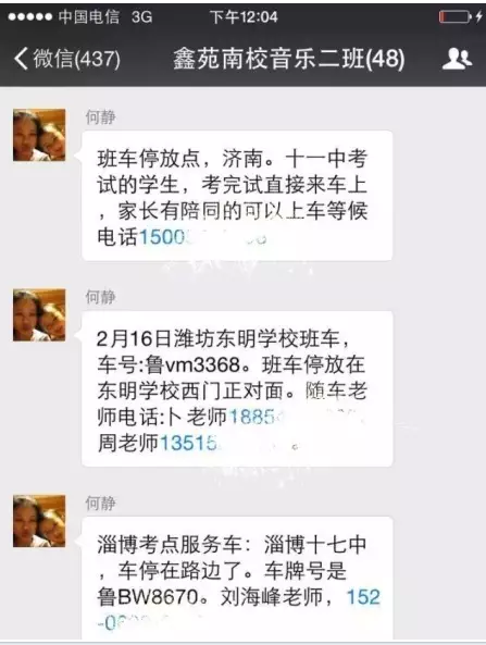老师们第一时间把考试的重要信息公布到群里面,包括潍坊考点考试学校的地点、山东理工大学帮助学生代报名后的时间,山东女子学院调节后的时间等每个考点的信息,老师们在第一线上尽职尽责,提醒孩子们考试