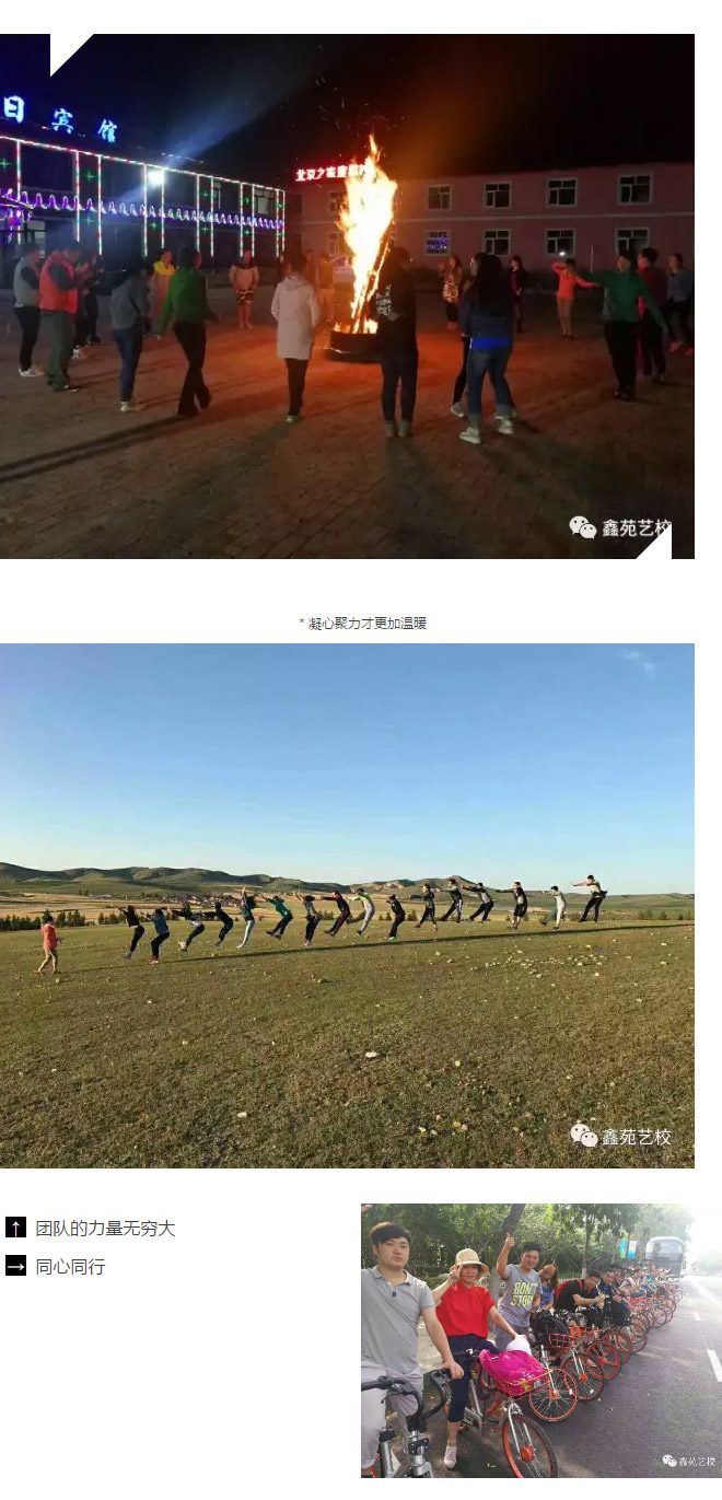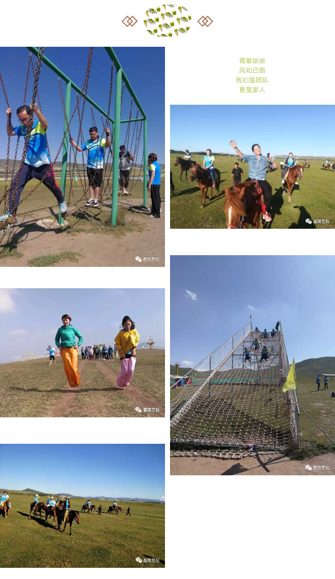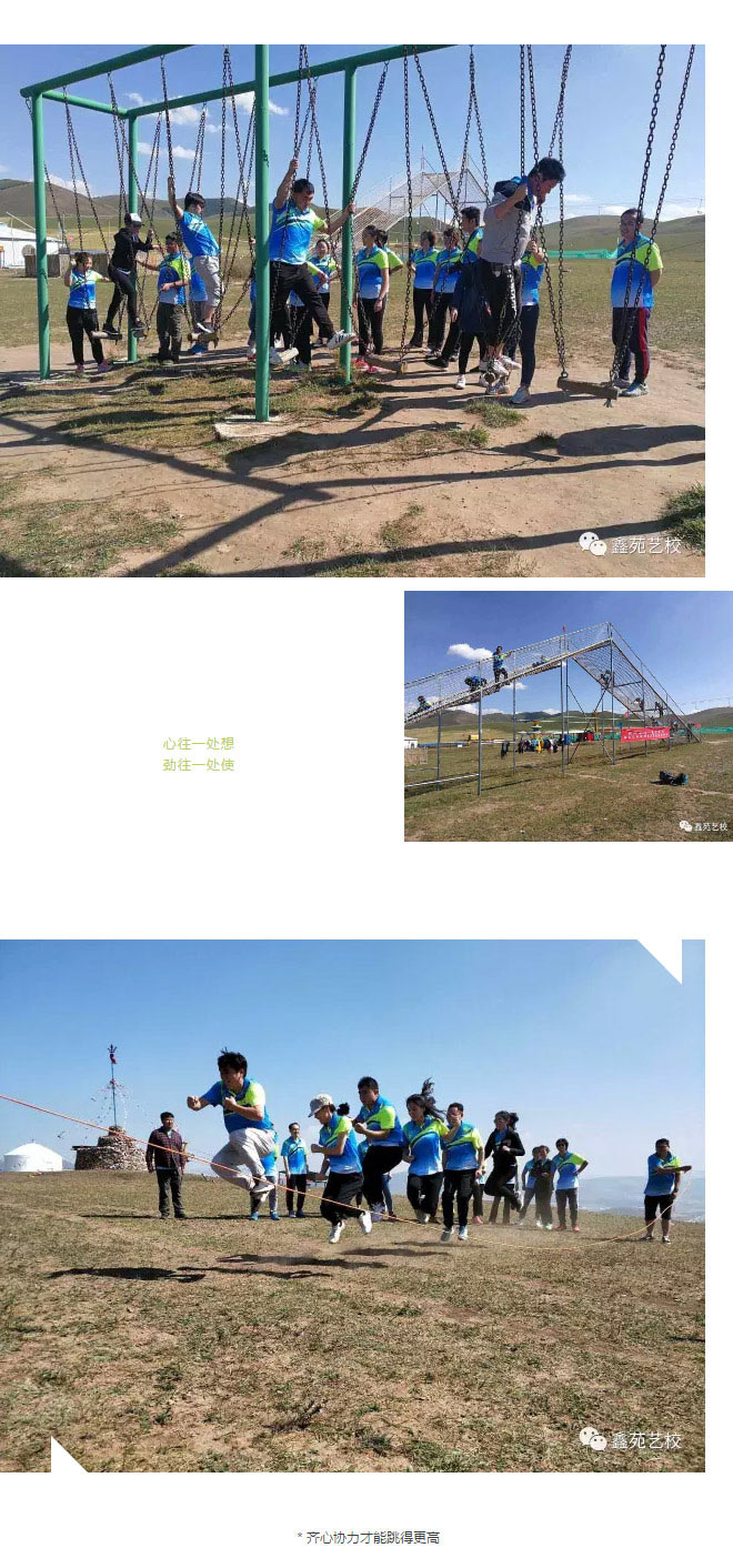 8月29日,鑫苑艺术教育全体教职工开展了“凝心聚力,赢在未来”教师职业素质拓展培训活动,我们从美丽的古北水镇、到辽阔的坝上草原,览名胜承德避暑山庄、骑行于历史悠久的天津五大道,都深刻的感受到团队力量所带给我们的无限的喜悦与幸福! 几天活动,项目很多,从袋鼠跳、背夹球、跳绳再到荡木桥,每一个团队项目并不是靠一个人的智力,体力和能力就能很好完成的,最大特点就是群策群力,一个人的成功不能代表整个团队的成功,只有团队中的每个个体相互团结,相互帮助,才能共同完成团队的目标.在本次拓展的过程中,老师们彼此信任,协作支持,将团队合作的精神更是发挥得淋漓尽致,同时此次外出之行让老师们在繁忙的工作中放松了身心,尽情领略大自然的无限美丽~