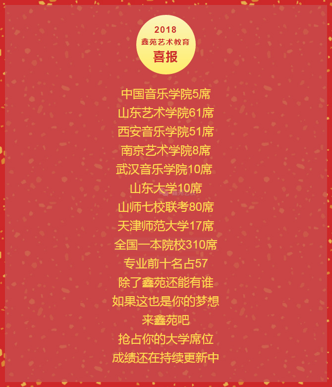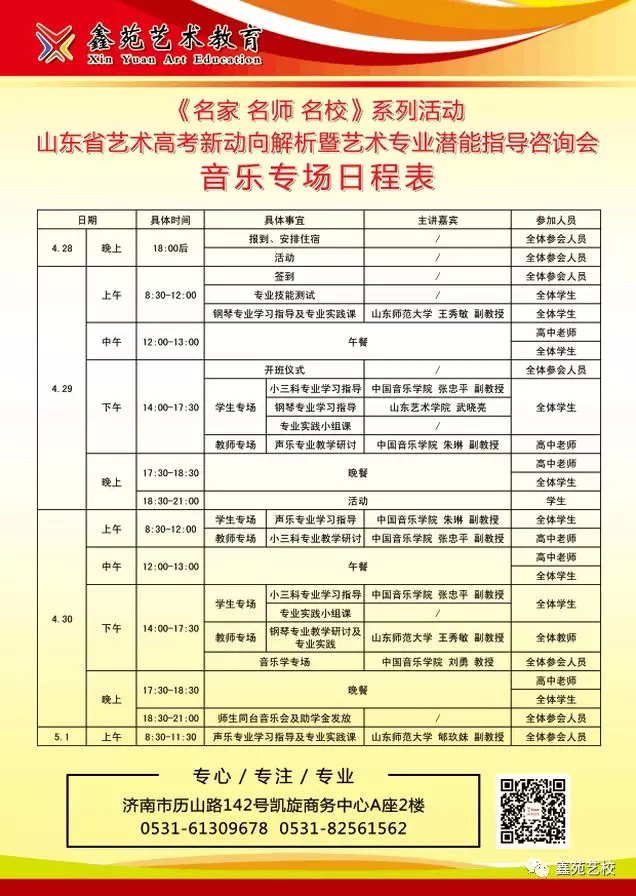 由中国教育在线与鑫苑艺术教育共同主办的“山东省艺术高考新动向解析暨艺术专业潜能指导咨询会”将于2018年4月29日在济南市鑫苑艺术教育山师校区隆重举行。