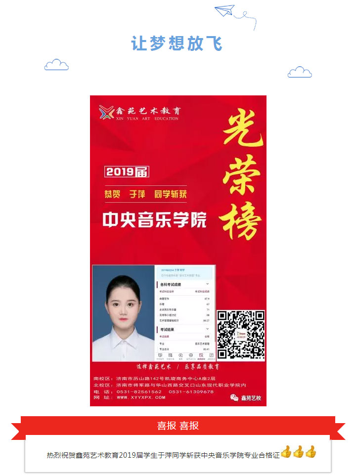 中央音乐学院成绩张榜!鑫苑学子于萍同学实力上榜!